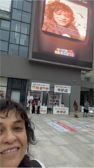 Tulipa x Tulipa: a artista vê um vídeo seu num telão na rua, em sua mais recente passagem pela China